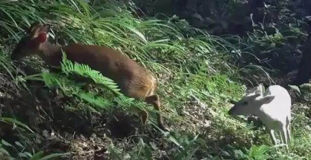 麂,俗稱麂子,其中以黃麂居多,而白麂最為罕見,在我國古代曾被稱為瑞獸。麂子喜歡獨居或者雌雄同棲,主要棲息在小山谷或者雜草叢中,很少會出現(xiàn)群體活動,外出覓食甚至用食過程中,也會隨時留意身邊四周的情況,一有風吹草動就會躲進密林中,能夠拍攝到兩種不同的麂類同框?qū)賹嶋y得。